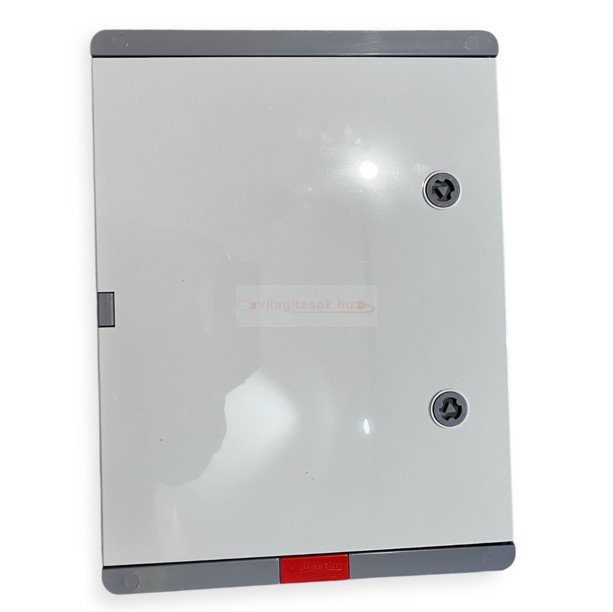 Műanyag villamos elosztószekrény szerelő lappal és szerelő fülekkel.