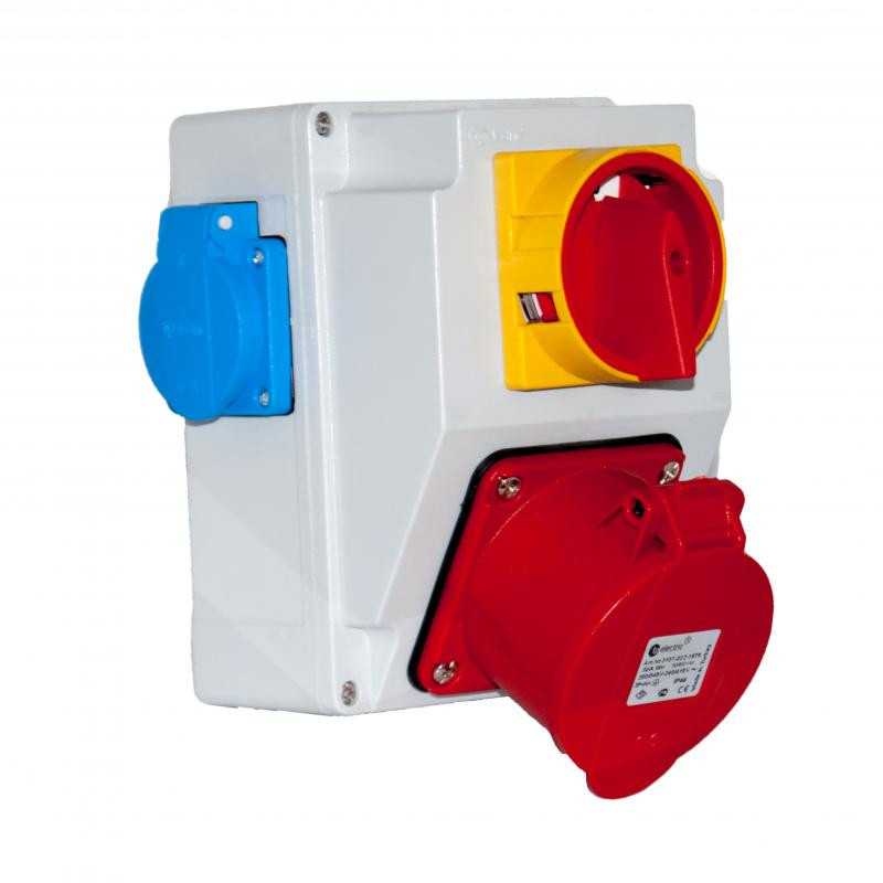 120x170mm, 1x 5p 32a-ip44 beép.dugalj + 2x 2p+f házt dugalj + 1db forgókapcsoló (32a)