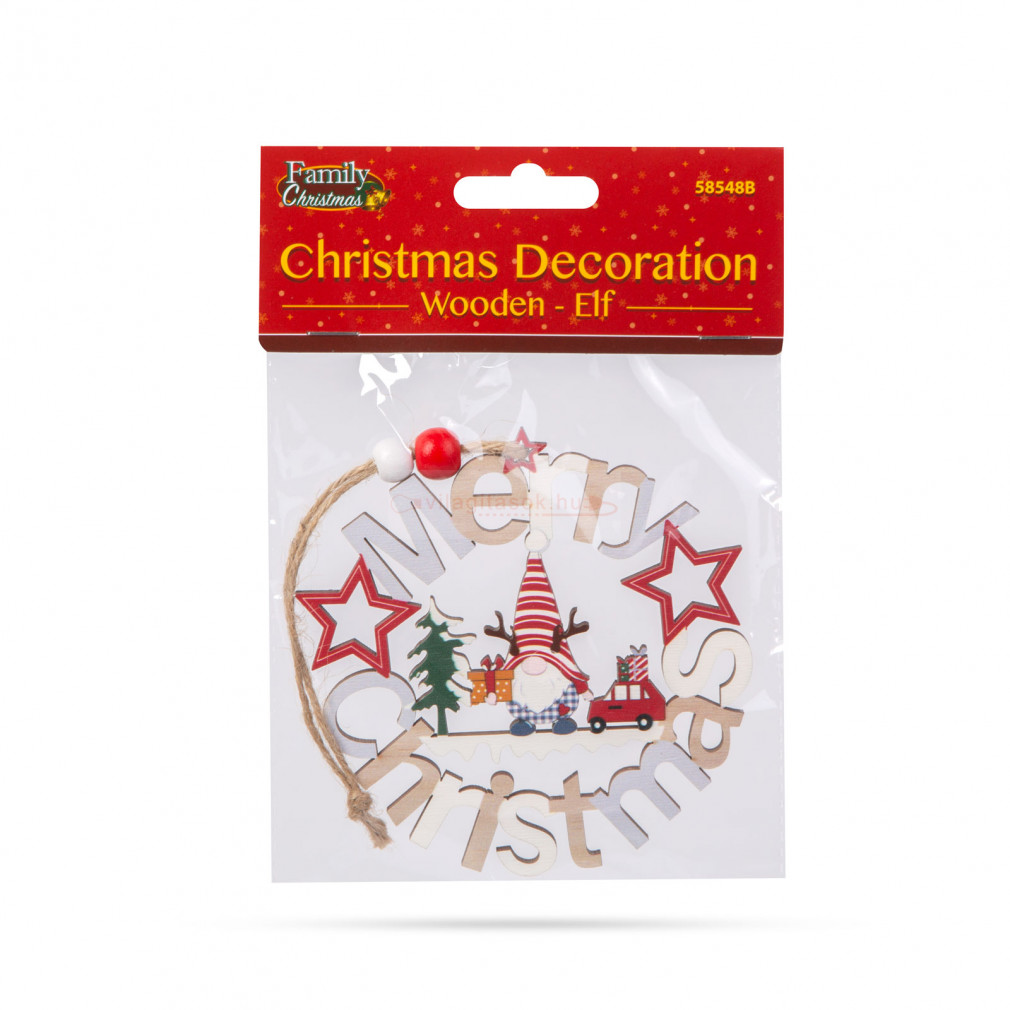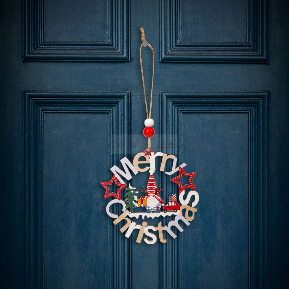 Ez a gyönyörű fából készült manó figurás dísz tökéletes kiegészítője lehet a karácsonyi dekorációnak otthonában. Szépen kidolgozott, aranyos manó figurák, amelyek "Merry Christmas" feliratban állnak, ami az ünnepi hangulatot és vidámságot sugallja. A fából készült díszek, melegséget és természetességet kölcsönöznek bármilyen ünnepi dekorációnak. A kidolgozott, részletesgazdag festés gondoskodik az aprólékos és szemet gyönyörködtető megjelenésről. A figura egy erős, de könnyű fából készült darab, amely felakasztható az otthona különböző pontjain.