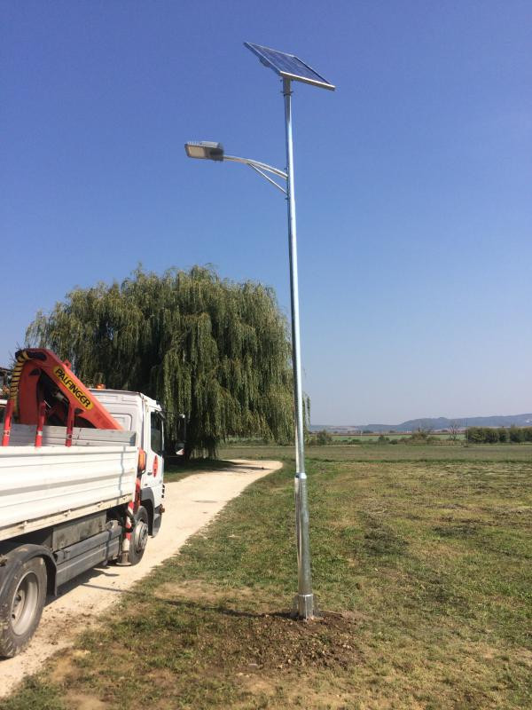 Acél lámpaoszlop csúcsára 1000x1000 mm-es napelemtartó.
