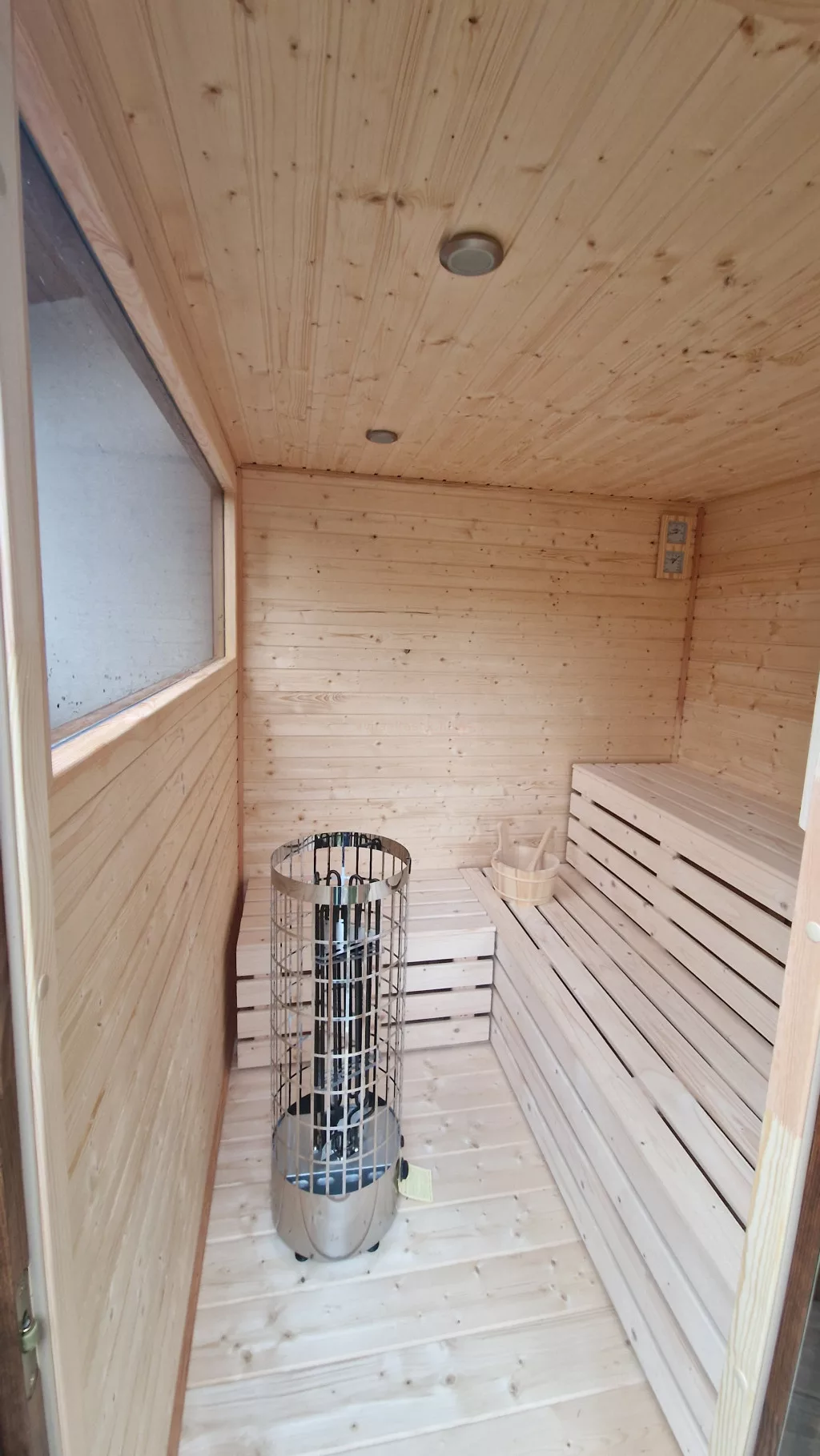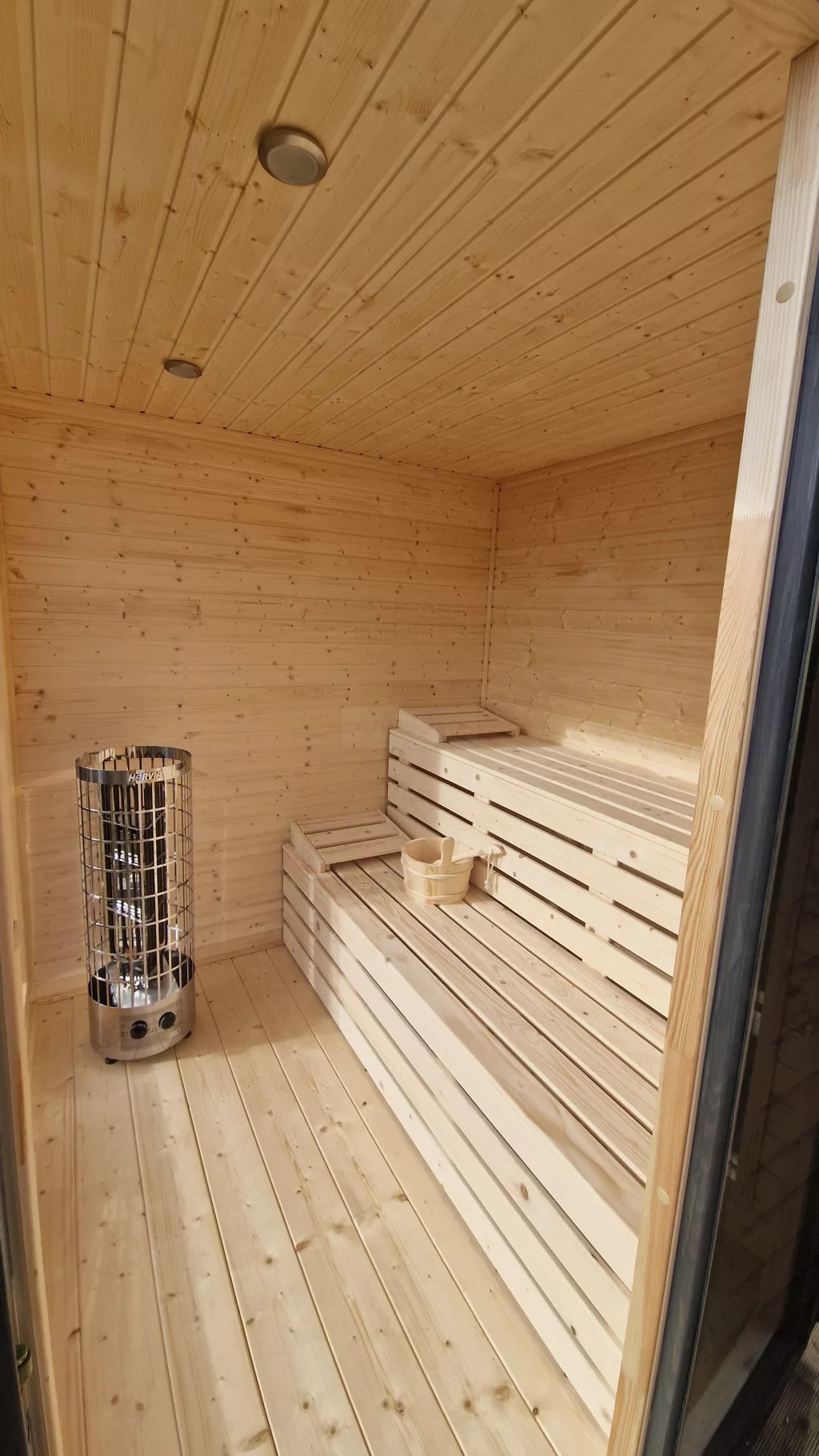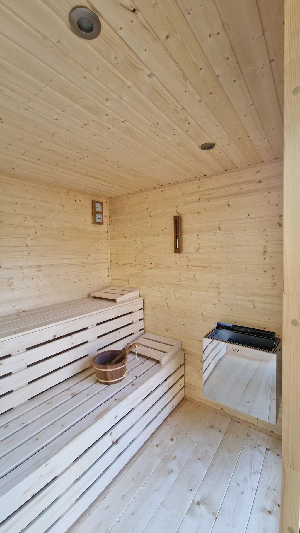 Im Innenraum sorgen Fichten-Profilholz und Fichten-Saunabänke für eine natürliche Optik und klassisches Saunaklima. Die doppelte Innenbank bietet bequeme Sitz- und Liegeflächen, sodass verschiedene Positionen beim Saunieren möglich sind. Ein Ofenschutz-Geländer rund um den Ofen erhöht die Sicherheit beim Aufenthalt im Saunaraum.