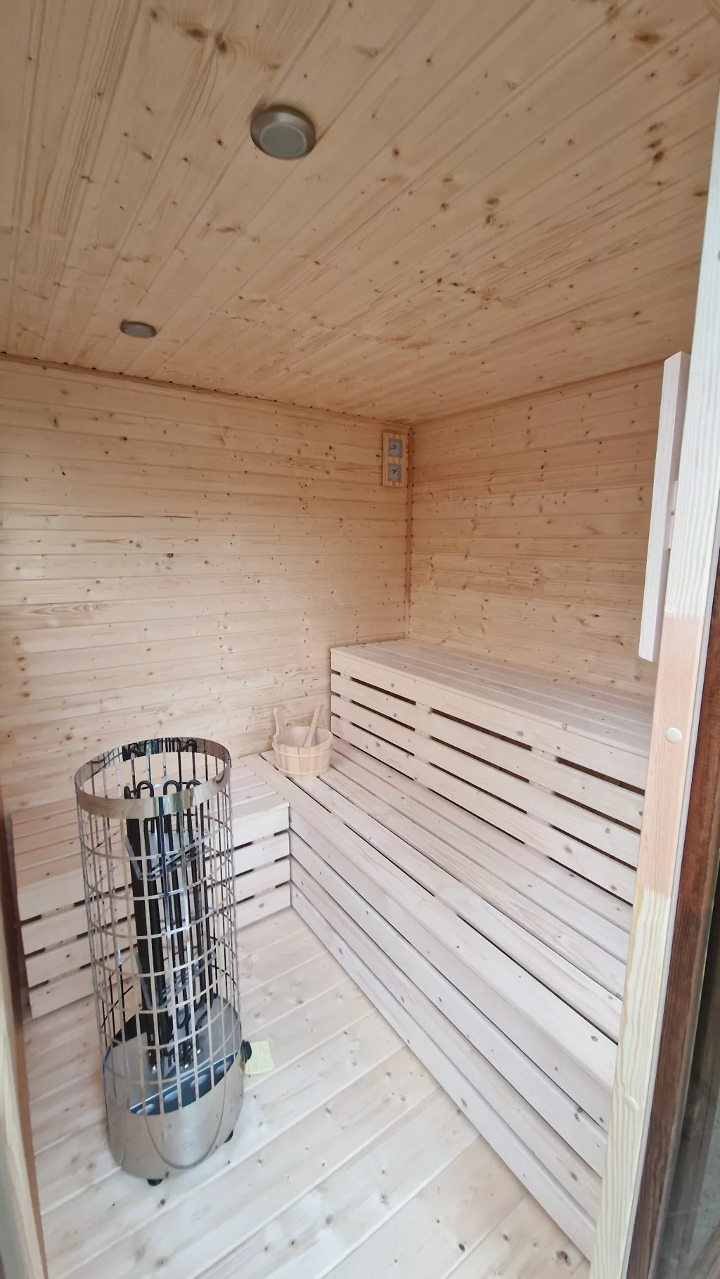 Als Wärmeerzeuger kommt ein 6 kW Harvia Vega Saunaofen mit passenden Saunasteinen zum Einsatz. Ergänzend sind ein Thermometer und ein Aufguss-Set im Lieferumfang enthalten, sodass die klassische finnische Saunanutzung direkt möglich ist.