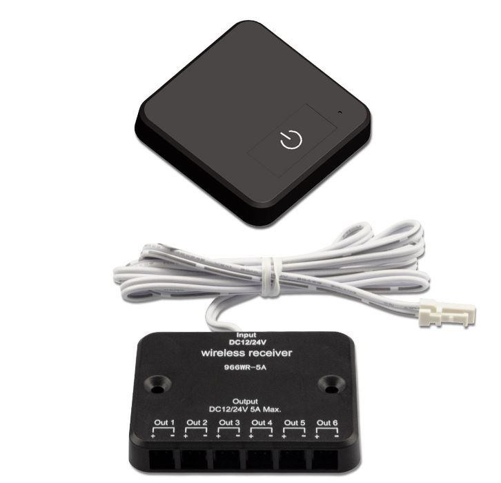 6-os elosztós MINIAMP csatlakozóval felszerelt gyorsan és egyszerűen telepíthető rádiófrekvenciás érintőgombos fényerőszabályzó.