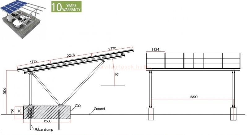 510W teljesítményű, nem tartozék) napelem beépítésére alkalmas. Az építmény mérete két autó parkolására alkalmas. Legalacsonyabb pontján 2,5 m magas. A