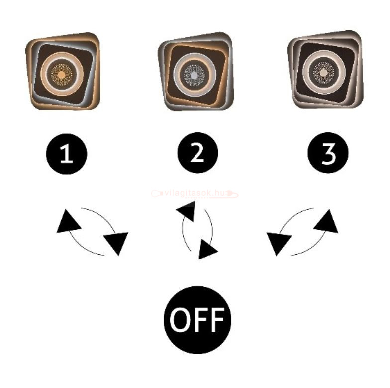 A termék rádiófrekvenciás távirányítójának segítségével, a módok közötti váltásokon kívül, lehetőségünk van fényerő és szinhőmérséklet állítására, valamint időzítő funkció bekapcsolására. Egyszeri megnyomással 5perces, kétszeri megnyomással 30perces időzítőt állíthatunk be és harmadik megnyomásra kikapcsolhatjuk az időzítő funkciót.
