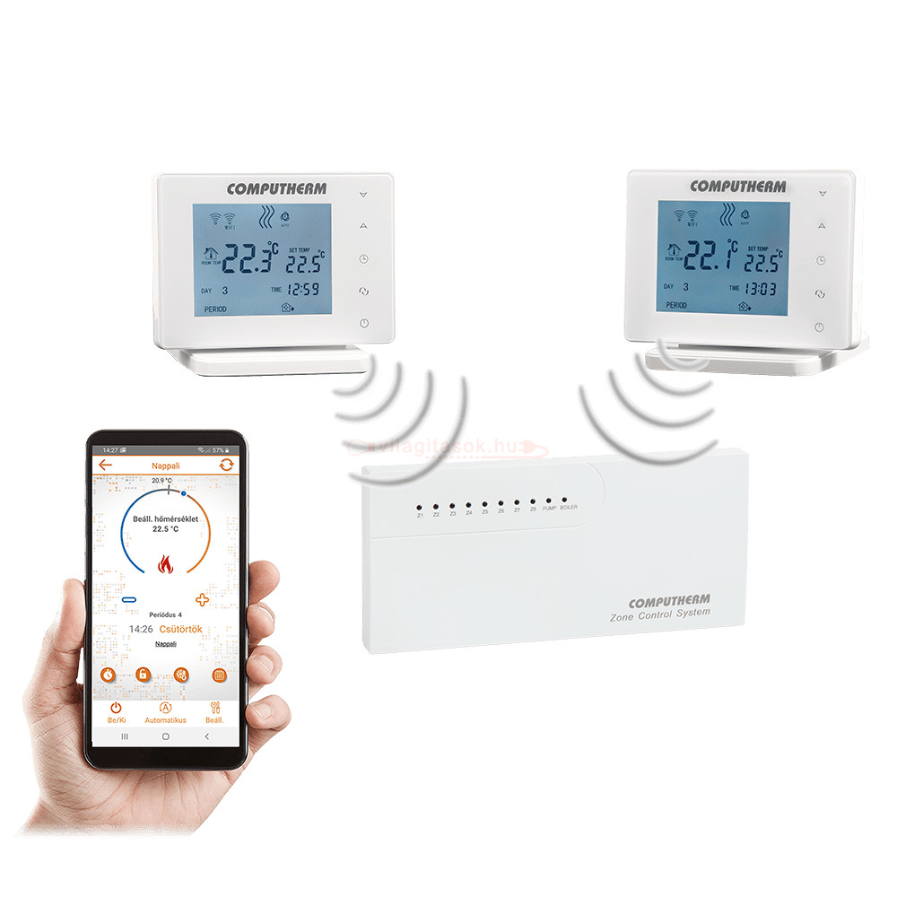 Az E800RF készülék alapcsomagja két vezeték nélküli programozható Wi-Fi termosztátot és egy vevőegységet tartalmaz. Igény esetén további 6 COMPUTHERM E800RF (TX) Wi-Fi termosztáttal bővíthető. A vevőegység fogadja a termosztátok kapcsolójeleit, vezérli a kazánt és parancsot ad a