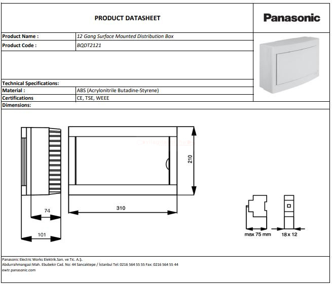 Panasonic lakáselosztó falon kívüli szereléshez, 12 modulhoz.