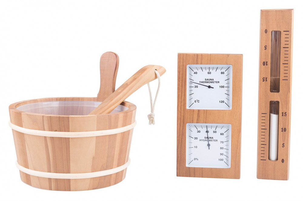 Setul de saună din pin cu găleată Thermo din plop include toate accesoriile esențiale pentru ședințe de saună confortabile și bine controlate. Elementele din lemn natural se integrează armonios în orice cabina de saună și ajută la monitorizarea temperaturii, umidității și timpului de utilizare.