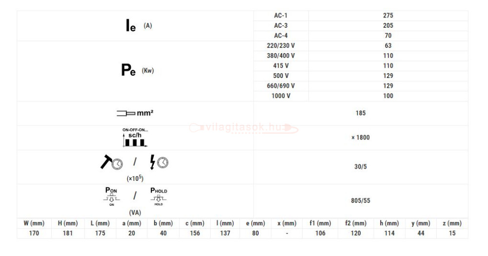 Névleges üzemi áram Ie AC-3, 400 V esetén: 205 A