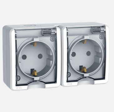 IP44-es védelemmel rendelkező átlátszó csapfedeles dupla dugalj.