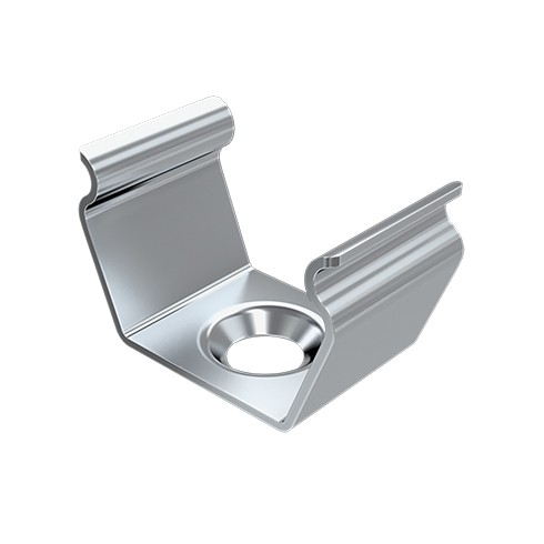 COSMO Alumínium LED profil rögzítőelem, mely fémből készült és egy furatot tartalmaz csavaros vagy függesztő sodrony rögzítéséhez.