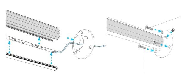 A rögzítő gyűrű a talpán lévő, három süllyesztett csavar furatnál rögzíthető csavarozással. Majd a Cosmo profilt becsúsztatva, a gyűrű egy pontján imbusz csavarral fixálható.