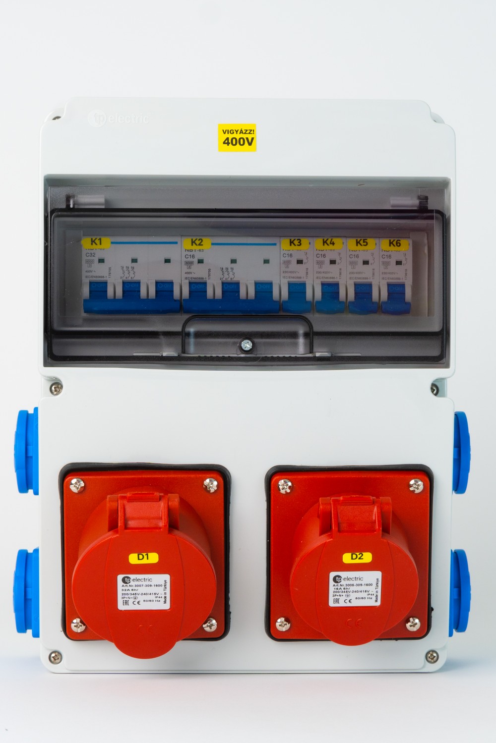Szerelt ipari doboz installációval, 220X300MM,1X(5P16A)+1X(5P32A)+4X(2P+F)oldalsó, IP44, kismegszakítóval