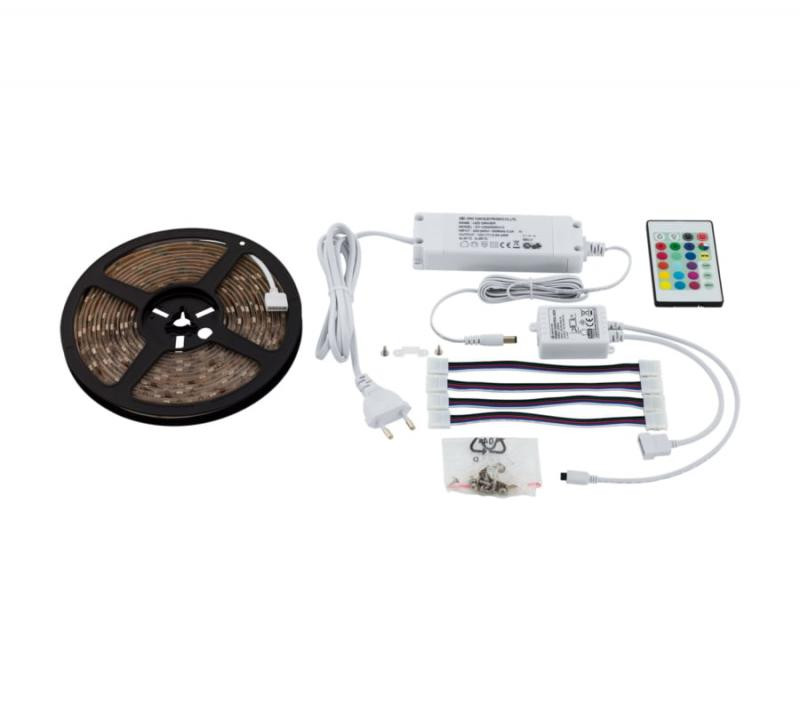 97928 EGLO LED STRIPES-Flex (RGB+W) színváltós LED szalag szett.Tartozékok: 500cm LED szalag, tápegység, vezérlő egység és távirányító. A távirányítóval fényerőszabályozható és színváltós. A LED szalag 3 LED-enként vágható.