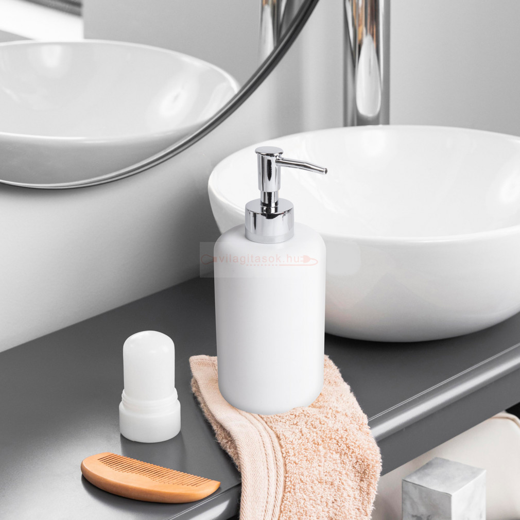 Ha fürdőszobájában vagy konyhájában eleganciára és funkcionalitásra törekszik, akkor ez a kézi pumpás szappanadagoló a tökéletes választás. A matt fehér színű alsó rész és az ezüst színű pumpa harmonikus kombinációja minden környezetben elegáns megjelenést garantál.
