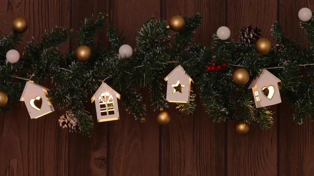 Karácsonyi LED fényfüzér dekoráció, fehér házikó,fa, elemes, 6+18h, 10LED, 3000K, 2xAA