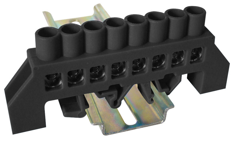 Szigetelt földelősín (N/PE), fekete 230/400VAC, 100A, 8×12mm, 8P, IP20